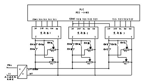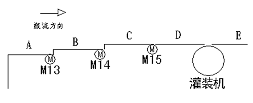 變頻器1﹑2﹑3的調(diào)速方式為兩種:1.來自灌裝機(jī)主機(jī)變頻器的模擬信號DC0~10V,經(jīng)過隔離器轉(zhuǎn)換為線性DC0~10V,再經(jīng)過電位器分壓作為變頻器1﹑2﹑3 的給定信號,以控制電機(jī)M13﹑M14﹑M15,這樣可以做到輸送帶與灌裝機(jī)的速度很好匹配;2.采用多段速控制端子SD﹑STF﹑RL﹑RM﹑RH,通過PLC編程,由PLC發(fā)出控制信號以控制速度。PLC根據(jù)灌裝機(jī)操作臺發(fā)出的信號來判斷使用那種速度控制方式,又根據(jù)瓶流情況選擇高低速。在模擬信號控制時是通過輔助繼電器KA1和KA2,KA3和KA4,KA5和KA6的組合,經(jīng)W1﹑W2,W3﹑W4,W5﹑W6分壓控制變頻器輸出速度。在多段速時通過PLC的輸出Y10﹑Y11﹑Y12﹑Y13,Y20﹑Y21﹑Y22﹑Y23,Y24﹑Y25﹑Y26﹑Y27分別調(diào)節(jié)各個變頻器的輸出頻率以達(dá)到多段輸送帶的速度匹配及與灌裝機(jī)的速度匹配。在模擬控制方式調(diào)整中,電位器分壓比的調(diào)整是個關(guān)鍵,通過生產(chǎn)調(diào)試中摸索,終于找到了比較好的速度匹配。分壓比一旦調(diào)好,不得隨意改動。