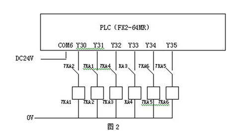 變頻器1﹑2﹑3分別控制電機(jī)M13﹑M14﹑M15,主回路接線圖略。PLC為FX2-64MR。FMA﹑11是來自灌裝機(jī)變頻器0~10V的輸出信號,經(jīng)過信號隔離器的轉(zhuǎn)換作為變頻器1﹑2﹑3的控制信號。圖中KA1-6為輔助繼電器。W1-6為分壓電位器。PLC的輸入端子略。FMA﹑11是來自灌裝機(jī)主機(jī)變頻器的輸出信號。兩圖中的PLC為同一PLC,圖2中的COM6接DC24V電壓,控制輔助繼電器。