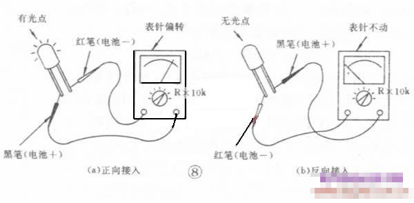 測試發(fā)光二極管的好壞,可以按照測試普通硅二極管正反向電阻的方法測試。指鐘式萬用表撥在R*100或R*1K檔,用黑表筆接發(fā)光二極管正極,紅表筆接負極,測得正向電阻應在20=40K;用黑表筆接發(fā)光二極管負極,紅表筆接正極,測得反向電阻應大于500K以上。用數(shù)字式萬用表撥在二極管檔,黑表筆接發(fā)光二極管正極,紅表筆接負極,阻值為無窮大。黑表筆接發(fā)光二極管負極,紅表筆接正極,發(fā)光二極管會有微亮,表示正常。測式方法如圖