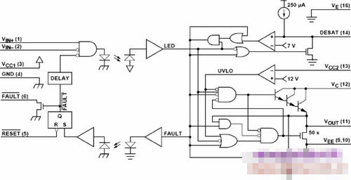 在剛剛上電的過程中,芯片供電電壓由0V逐漸上升到最大值。如果此時芯片有輸出會造成IGBT門極電壓過低,那么它會工作在線性放大區(qū)。HCPL316J芯片的欠壓鎖定保護的功能(UVLO)可以解決此問題。當VCC與VE之間的電壓值小于12V時,輸出低電平,以防止IGBT工作在線性工作區(qū)造成發(fā)熱過多進而燒毀。示意圖詳見圖1中含UVLO部分。