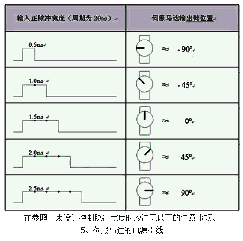 隔離(因為伺服馬達會產(chǎn)生噪音)。甚至小伺服馬達在重負載時也會拉低放大器的電壓,所以整 個系統(tǒng)的電源供應(yīng)的比例必須合理。 輸入一個周期性的正向脈沖信號,這個周期性脈沖信號的高電平時間通常在1ms—2ms之間,而低電平時間應(yīng)在5ms到20ms之間,并不很嚴格,下表表示出一個典型的20ms周期性脈沖 的正脈沖寬度與微型伺服馬達的輸出臂位置的關(guān)系: 在參照上表設(shè)計控制脈沖寬度時應(yīng)注意以下的注意事項。
