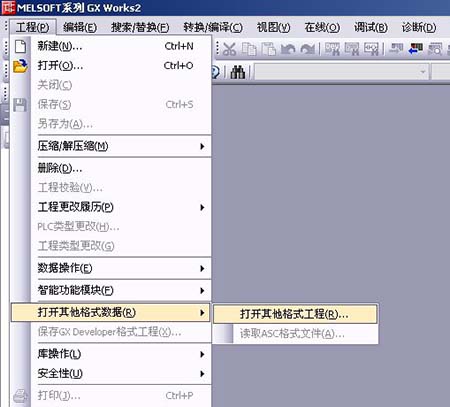 1 步:在 GX Works2 中,點(diǎn)工程、打開(kāi)其他格式數(shù)據(jù)、打開(kāi)其他格式工程;