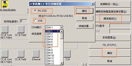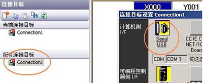 編程電纜插傳統(tǒng)的圓孔時(shí),連接目標(biāo)設(shè)置選擇 RS-232C,并且要選擇相應(yīng)的 COM 編程電纜插迷你 USB 時(shí),連接目標(biāo)設(shè)置選擇 USB。