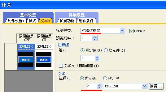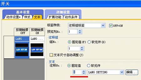 我們?cè)诖翱诋嬅嬷屑尤雰蓚€(gè)開關(guān)做語言切換和一個(gè)返回開關(guān)。開關(guān)的建立和第一個(gè)開關(guān)建立相似,標(biāo)簽種類都為注釋組標(biāo)簽,動(dòng)作都設(shè)為點(diǎn)動(dòng)。軟元件名分別為 M10、M11、M12。文本注釋 NO 的固定值分別為 2、3、4。