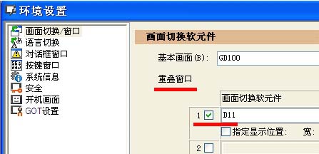 在環(huán)境設(shè)置對(duì)話框中,重疊窗口這一欄選中第 1 個(gè)復(fù)選框,然后在畫面切換軟元件中輸入一個(gè)字元件。其它地方不做修改,點(diǎn)擊確定。