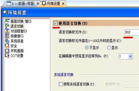 按下 M10 或初始化默認(rèn),給 D10 傳送值 1,使其顯示所設(shè)定一種語言。按下 M11,給 D10 傳送值 2,使其顯示另一種語言。