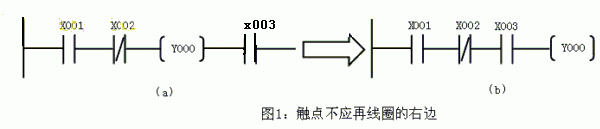 一,PLC梯形階梯都是始于左母線,終于右母線(通??梢允〉舨划?,僅畫左母線)。每行的左邊是接點(diǎn)組合,表示驅(qū)動邏輯線圈的條件,而表示結(jié)果的邏輯線圈只能接在右邊的母線上。接點(diǎn)不能出現(xiàn)在線圈右邊。如下圖(a)應(yīng)改為(b):