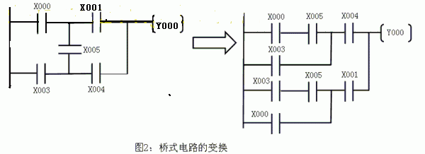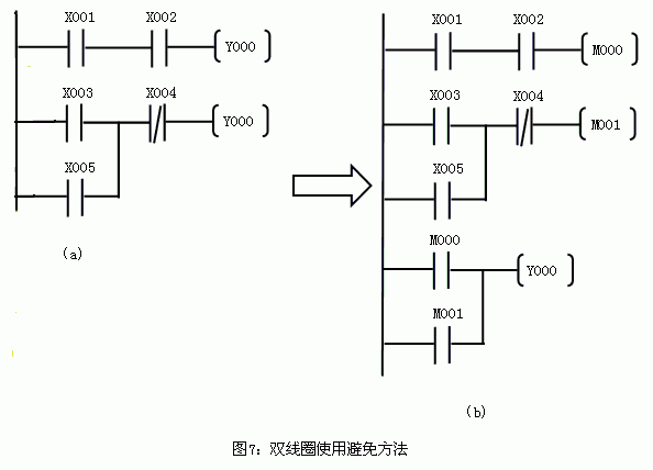 圖(b)中,X001和X002接點(diǎn)控制輔助繼電器M000,X003~X005接點(diǎn)控制輔助繼電器M001,再由兩個繼電器M000,M001接點(diǎn)的并聯(lián)組合去控制線圈Y000。這樣邏輯關(guān)系沒變,卻把雙線圈變成單線圈。