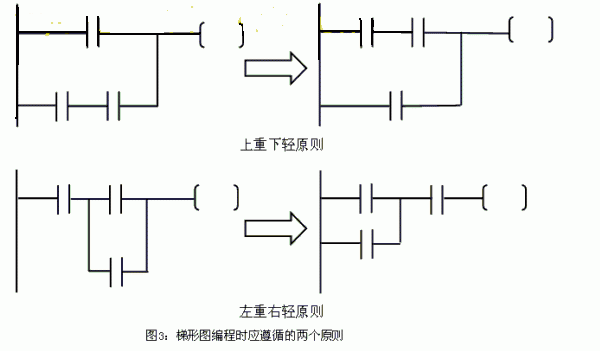 三,并聯(lián)塊串聯(lián)時,應(yīng)將接點(diǎn)多的去路放在梯形圖左方(左重右輕原則);串聯(lián)塊并聯(lián)時,應(yīng)將接點(diǎn)多的并聯(lián)去路放在梯形圖的上方(上重下輕的原則)。這樣做,程序簡潔,從而減少指令的掃描時間,這對于一些大型的程序尤為重要。如下圖所示: