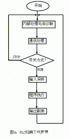 PLC的CPU采用循環(huán)掃描的工作方式。一般包括五個階段(如圖所示):內(nèi)部診斷與處理,與外設(shè)進(jìn)行通訊,輸入采樣,用戶程序執(zhí)行和輸出刷新。當(dāng)方式開關(guān)處于STOP時,只執(zhí)行前兩個階段:內(nèi)部診斷與處理,與外設(shè)進(jìn)行通訊。