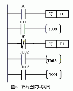 注意:我們所說的是不宜(最好不要)使用雙線圈,雙線圈使用并不是絕對禁止的,在一些特殊的場合也可以使用雙線圈,這時就需要你有較豐富的編程經(jīng)驗和技巧了。下面我們會談到這一點(diǎn)。但對于初學(xué)者還是不要冒這個險。其實,從以上的例子可以看出,重復(fù)利用線圈之所以會造成Y003的輸出混亂,是由于程序是從上到下順序執(zhí)行的緣故造成的。但如果我們可以改變程序執(zhí)行的順序,保證在任何時刻兩個線圈只有一個驅(qū)動邏輯發(fā)生,就可以使用雙線圈。其中,最常用的方法就是使用跳轉(zhuǎn)指令。如下圖所示: