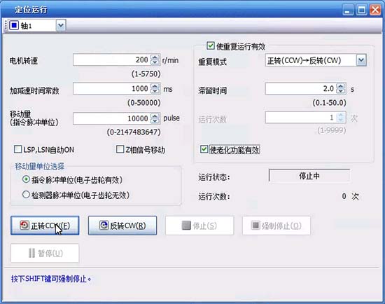 2、 打開<測試運行>菜單下<定位運行>,設(shè)置轉(zhuǎn)速/加減速/移動量,根據(jù)實際情況設(shè)置,移動量不需要設(shè)置太大。打鉤<重復(fù)運行有效>和<老化功能有效>,作用是實現(xiàn)重復(fù)往復(fù)運動,然后點擊運行啟動,這樣電機就可以自動往復(fù)運行了,為一鍵式調(diào)整做好準備。