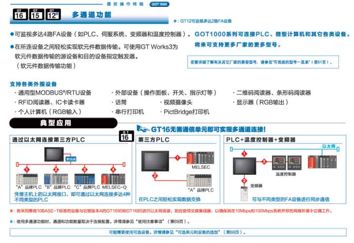 回答:可以。三菱的觸摸屏 GOT1000 系列中的 GT11/15 系列可以直接連接歐姆龍、神港技術(shù)、Chino、富士、山武等品牌的溫度調(diào)節(jié)器/指示調(diào)節(jié)計(jì),可以直接連接三菱電變頻