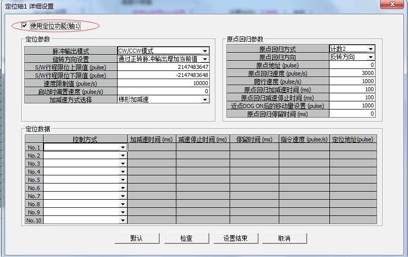 在設置三菱PLC參數(shù)時,只需要勾選軸有效,對應的參數(shù)就會自動生成,但是如果先設置三菱PLC參數(shù),再去勾選,就會出現(xiàn)這樣的情況。所以其最大的錯誤就在于未勾選使用定位功能(軸1),如下圖所示: