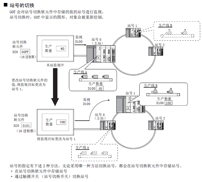 二:實際使用中根據(jù)不同機臺切換站號即可,三菱觸摸屏支持站號切換,將站號規(guī)定為軟元件從而靈活設(shè)置站號的切換