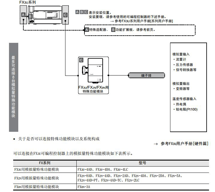 下面的圖片是小編從三菱FX3U系列PLC用戶手冊(硬件篇)上截下來的,都是一些關于三菱FX3U系列PLC連接三菱PLC擴展模塊的說明以及方法!