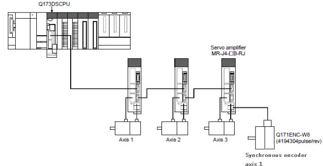 首先在如下圖所示,外部同步編碼器可以通過以下三種方式連接到三菱PLC Q172DS Motion的控制系統(tǒng)當中。通過外部連接的同步編碼器的輸入脈沖驅動輸入軸,投入電源后就可以監(jiān)控同步編碼器的狀態(tài).