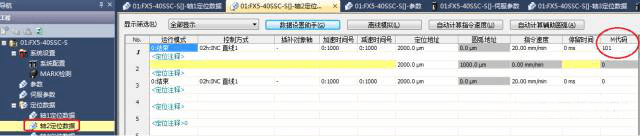 其次,在定位數(shù)據(jù)的最后一列,就是設置M代碼的地方,每一個定位數(shù)據(jù)都可以設置一個M代碼,M代碼可以在1-65535中任意設置一個整數(shù)(設為0則表示不使用),同一軸的定位數(shù)據(jù)里,M代碼不要設為一樣,不同軸之間則無所謂。比如,在本例中,軸1定位數(shù)據(jù)1的M代碼設置為100,定位數(shù)據(jù)2的M代碼設置為102。 為了在程序中不混淆,軸2定位數(shù)據(jù)1的M代碼設置為101。