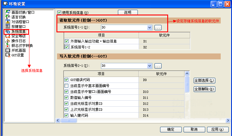 點擊菜單欄中的“公共設(shè)置”中的“GOT環(huán)境設(shè)置”選擇里面的系統(tǒng)信息,打開系統(tǒng)信息對話框,如圖所示: