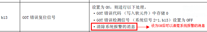 系統(tǒng)信號1-1中每一位都有其相應(yīng)的意思,詳情請參看三菱觸摸屏手冊公共篇中系統(tǒng)信息內(nèi)容說明中的介紹,在這里面我們需要清除這些報警信息,必須把D0中的b13位置為ON,b13位的作用如下圖所示。