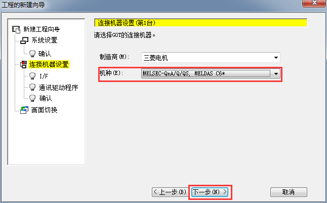 2.1.4 設(shè)置連接機(jī)種類型,需根據(jù)機(jī)種選擇,后單擊[下一步]