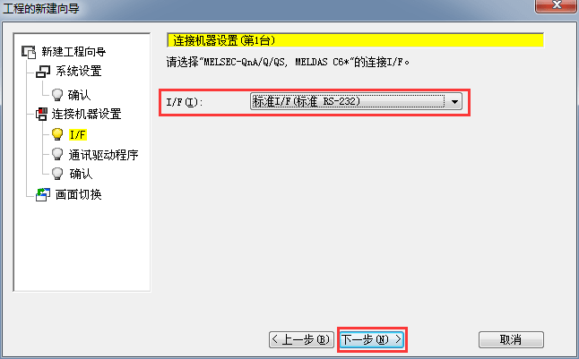 2.1.5 設(shè)置I/F端連接設(shè)置,(標(biāo)準(zhǔn)I/F 標(biāo)準(zhǔn) RS232)默認(rèn),后單擊[下一步]