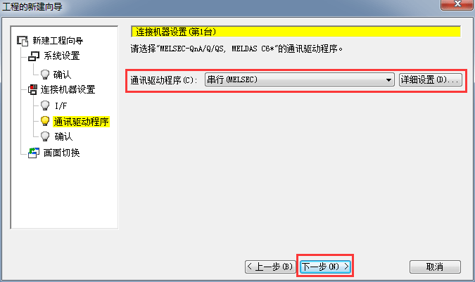 2.1.6 設(shè)置通訊啟動(dòng)驅(qū)動(dòng),(串行MELSEC)默認(rèn),后單擊[下一步]