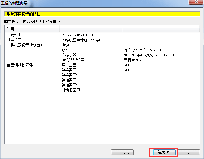 2.1.9 系統(tǒng)環(huán)境設(shè)置確認(rèn),單擊[結(jié)束],到此完成一個(gè)工程項(xiàng)目新建。