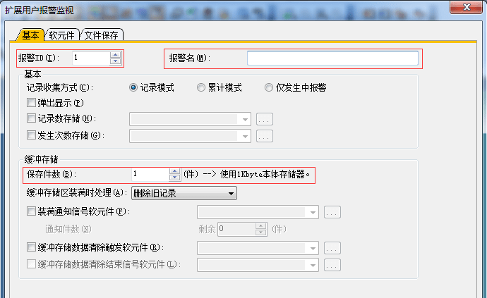 2.3.3 擴(kuò)展用戶報(bào)警監(jiān)視-基本設(shè)置,設(shè)置報(bào)警ID及名稱,一般默認(rèn)1,報(bào)警名可自定義,保存件數(shù)(設(shè)置與報(bào)警點(diǎn)數(shù)相同)可增加,用于報(bào)警存放報(bào)警點(diǎn)數(shù)。
