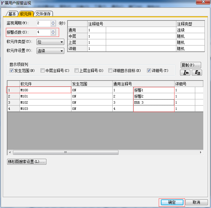 2.3.3 擴(kuò)展用戶報(bào)警監(jiān)視-軟元件設(shè)置,設(shè)置完后單擊[確認(rèn)]