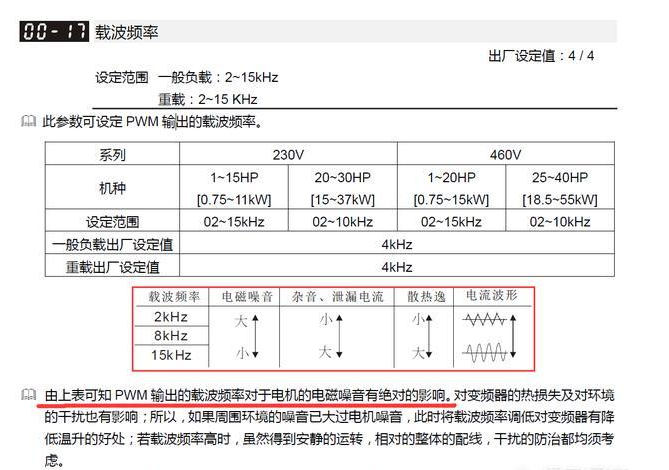 載波頻率是變頻器內(nèi)部導(dǎo)通開關(guān)管的PWM(脈沖寬度調(diào)制)頻率,它對(duì)電機(jī)的電磁噪聲有絕對(duì)的影響;