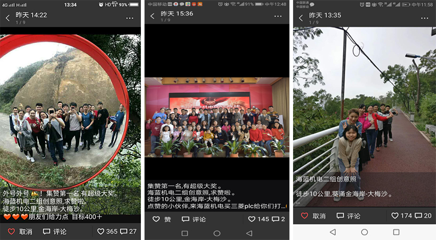早餐完畢,約摸九點。我們各組便帶上任務開始了徒步之旅,從金海岸徒步至大梅沙食午飯,總程約10公里。大家是不是很好奇,這個任務是什么,竟要徒步10公里來完成,其實這個任務很簡單,就是徒步過程中,各組組員一起完成創(chuàng)意拍照,然后前去朋友圈收集點贊,點贊者最多的組可獲得神秘禮品一份(領導為了我們鍛煉身體也是用心良苦了)。于是我們都使出了各種招兒,讓朋友幫自己點贊,甚至不惜群發(fā)騷擾-_- ,這會我想我應該被不少人拉黑了吧。