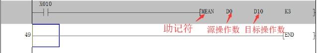 上圖中的例子就是說(shuō)當(dāng)X10觸點(diǎn)接通,執(zhí)行命令MEAN,求3個(gè)數(shù)據(jù)寄存器D0~D2中的數(shù)據(jù)的平均值,并將結(jié)果存到D10中去。